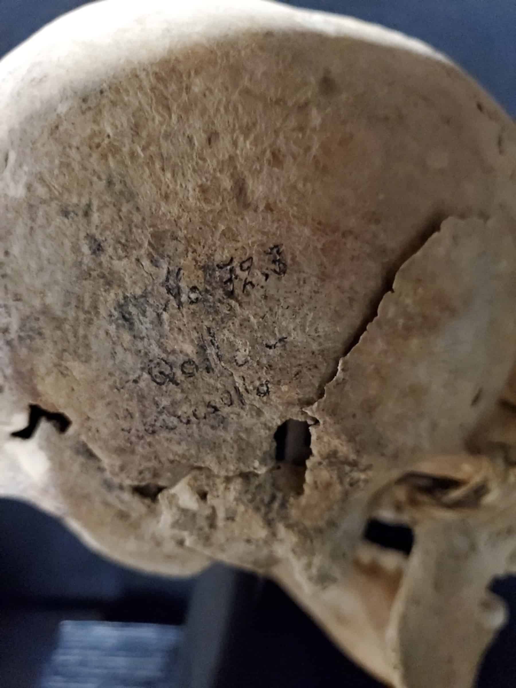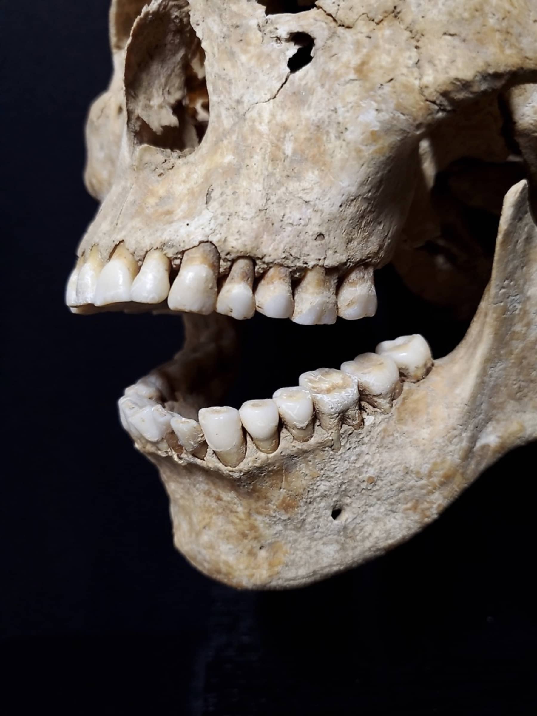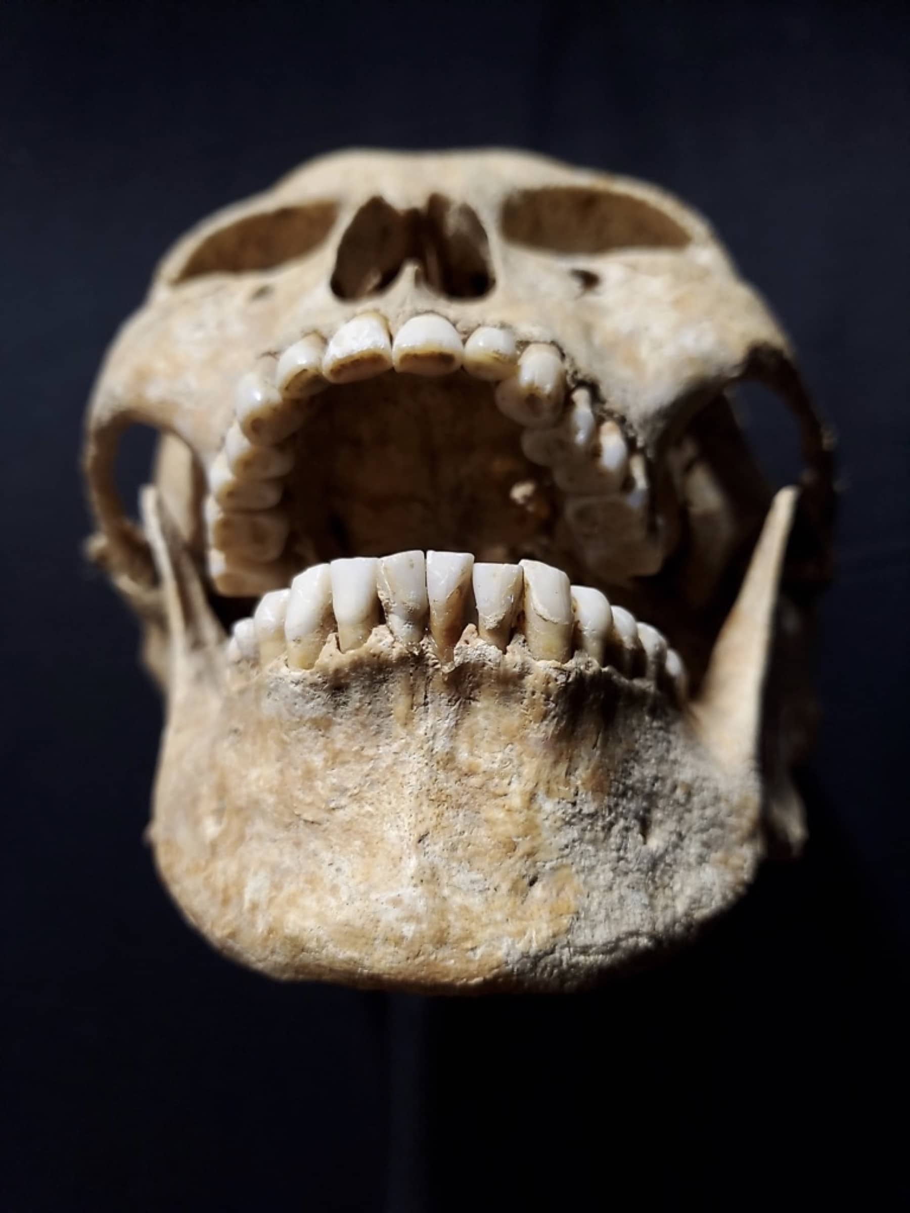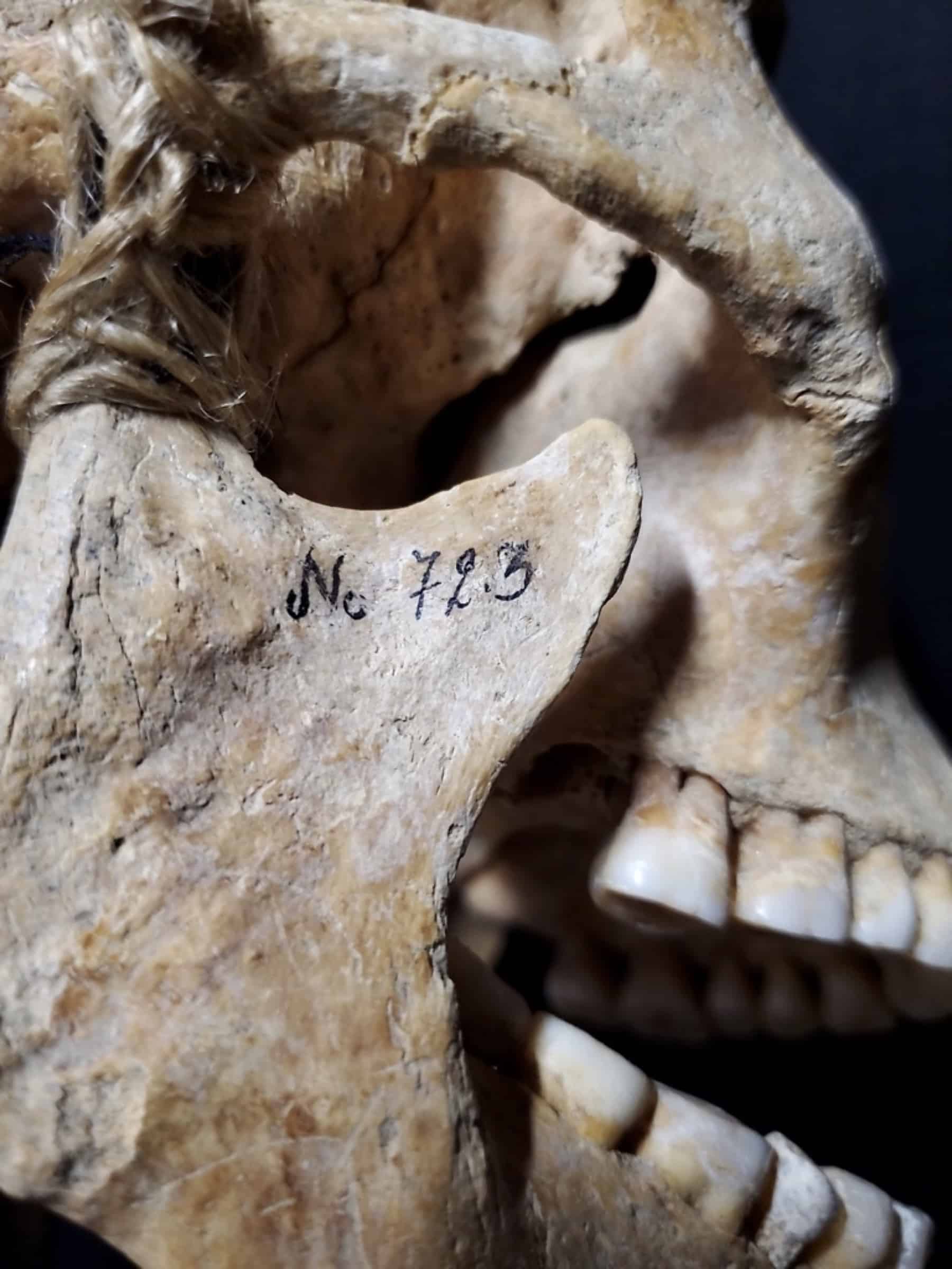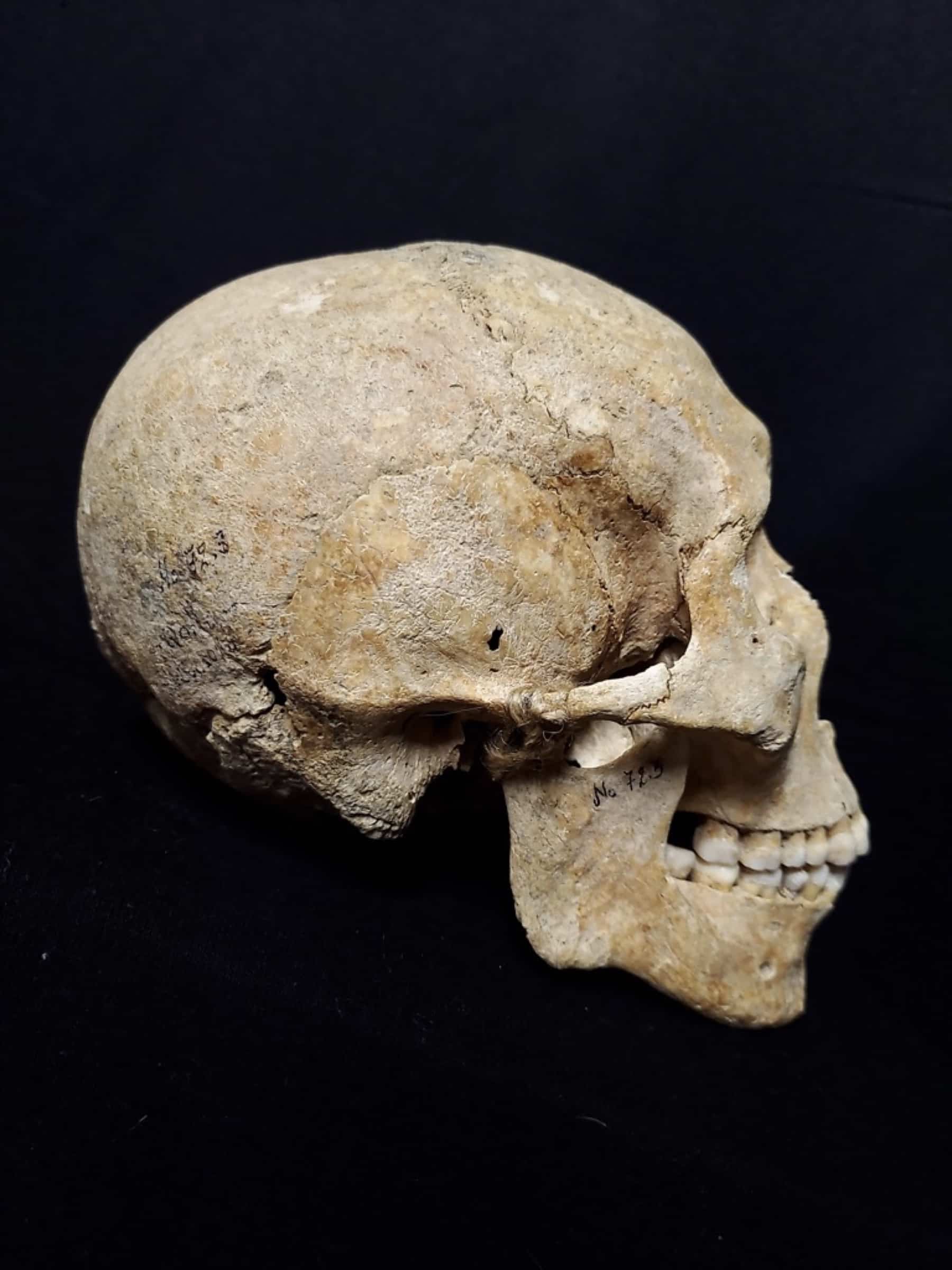 This skull has been meticulously reconstructed and as such, is very delicate. It bears handwritten descriptions on the right temporal bone, and matching “No. 72.3” notes on both the calvarium and the lower mandible. Dentition is in perfect condition, with the upper molars missing pre-mortem, and all teeth showing typical signs of a diet consistent with the Qulla people.